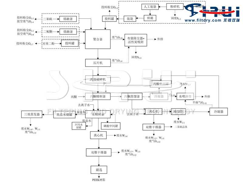 向水精制釜内加入少量磷酸溶液冲洗(磷酸主要是调节pH),搅拌冲洗完毕后打开磷酸中间槽阀门,用氮气将水精制釜内稀磷酸溶液压滤至磷酸中间槽内,循环使用。而后向水洗釜中再次加入去离子水继续精制(少量氟化钠),该过程重复约6次,至水溶液的电导率为10us/cm,此部分水洗后的滤液排入精制水回用储罐。回用水储罐中去离子水可作为下一批前段工序的精制水重复使用。除去氟化钠的湿品PEEK树脂转入下一步工序。