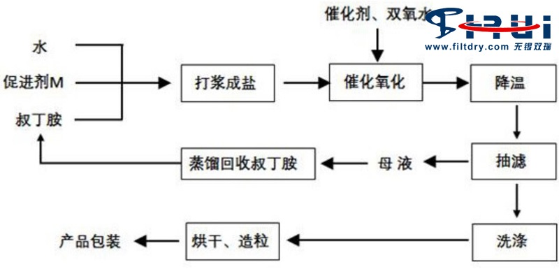 针对现有技术存在的不足,新型橡胶硫化促进剂NS的合成提纯方法,以双氧水为氧化剂,通过催化剂和筒锥式过滤洗涤二合一工艺,提高了产品质量和收率,而且工艺操作简单、绿色环保。与现有技术相比,新工艺的优点在于:
