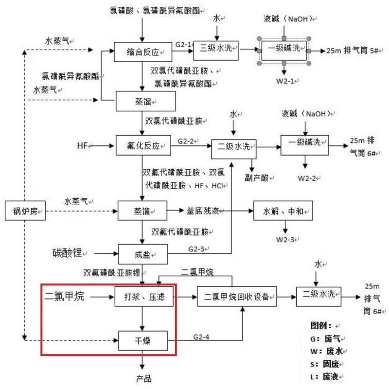 结晶后进入三合一进行过滤,母液蒸馏经一级-15℃冷冻盐水+-50℃深冷回收氟化氢。过滤固体在三合一中加入二氯甲烷溶剂进行洗涤、过滤,过滤母液蒸馏经一级 15℃冷冻盐水+-50℃深冷回收二氯甲烷。粗品减压干燥得到双氟磺酰亚胺锂。