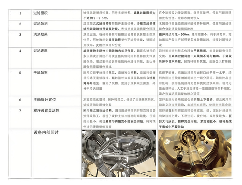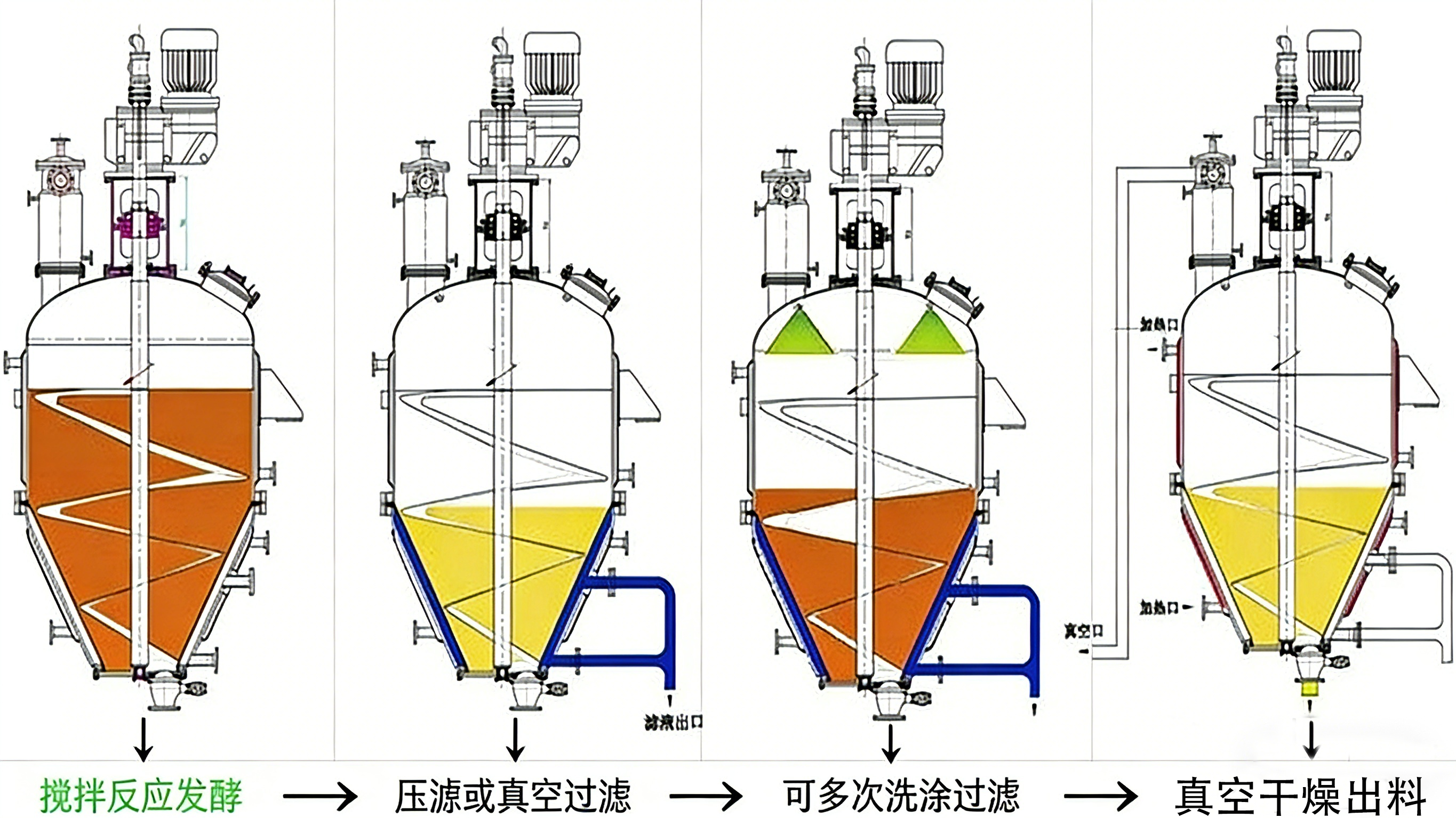 过滤——顶部进料,滤液由底部排出;洗涤——罐内装有特制的喷淋装置,可使清洗(洗涤)液均匀将晶粒表面粘附的杂质洗涤干净;干燥——加热蒸汽自侧壁夹套进入,冷凝水自底部盘管排出,搅拌器翻动物料,上部抽真空,真空口设有布袋分离器;卸料时——打开放料阀,由搅拌浆将物料推出。