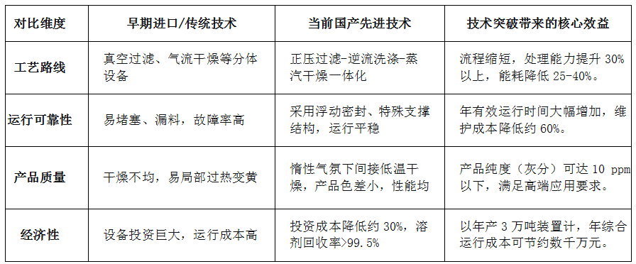 通过国家重大科技专项支持与产学研联合攻关,我国成功开发了拥有完全自主知识产权的PPE过洗干一体机成套技术。该技术集成了旋转压力连续正压过滤、多级逆流洗涤和蒸汽管回转干燥三大核心单元,实现了工艺的本质创新。