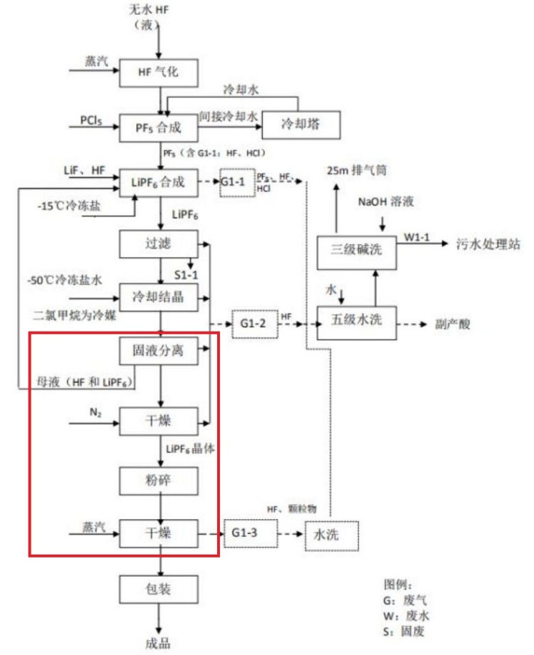 结晶采取静止结晶的方法,在-20℃条件下六氟磷酸锂冷却结晶。结晶结束后,进行固液分离,分离后母液送母液储槽循环使用。冷却、结晶及放液过程中溢出的少量 HF 进入废气。