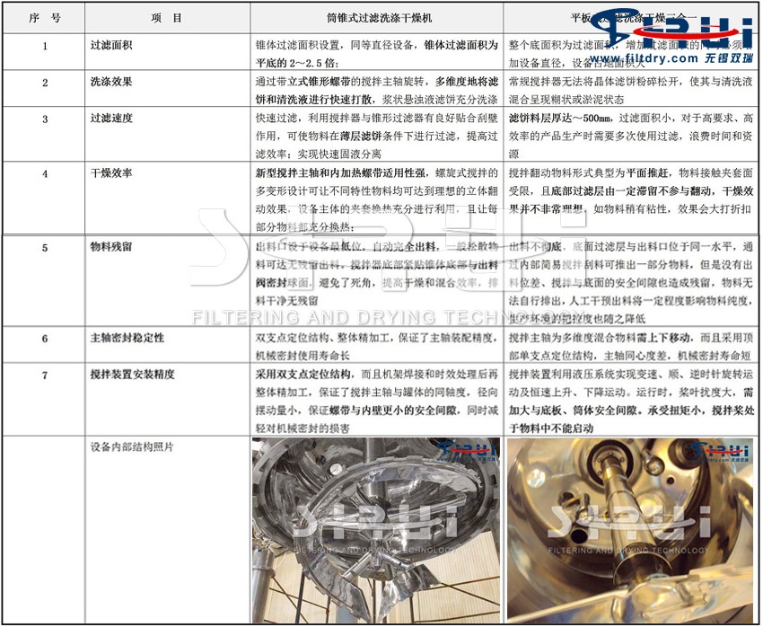 新型过滤洗涤干燥机为筒锥式结构,在圆筒体和下部锥体上设置有加热夹套,可对物料进行加热或冷却,在多功能机内部设置有空心轴和变角度变导程空心螺旋搅拌装置搅拌,对物料进行搅拌和提升,在出料时推出物料。在下部锥体内设置有结构较为复杂的圆锥形过滤装置,在设备底部有特殊设计的无死角快开出料装置或无死角气动出料球阀。