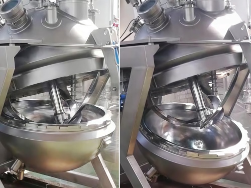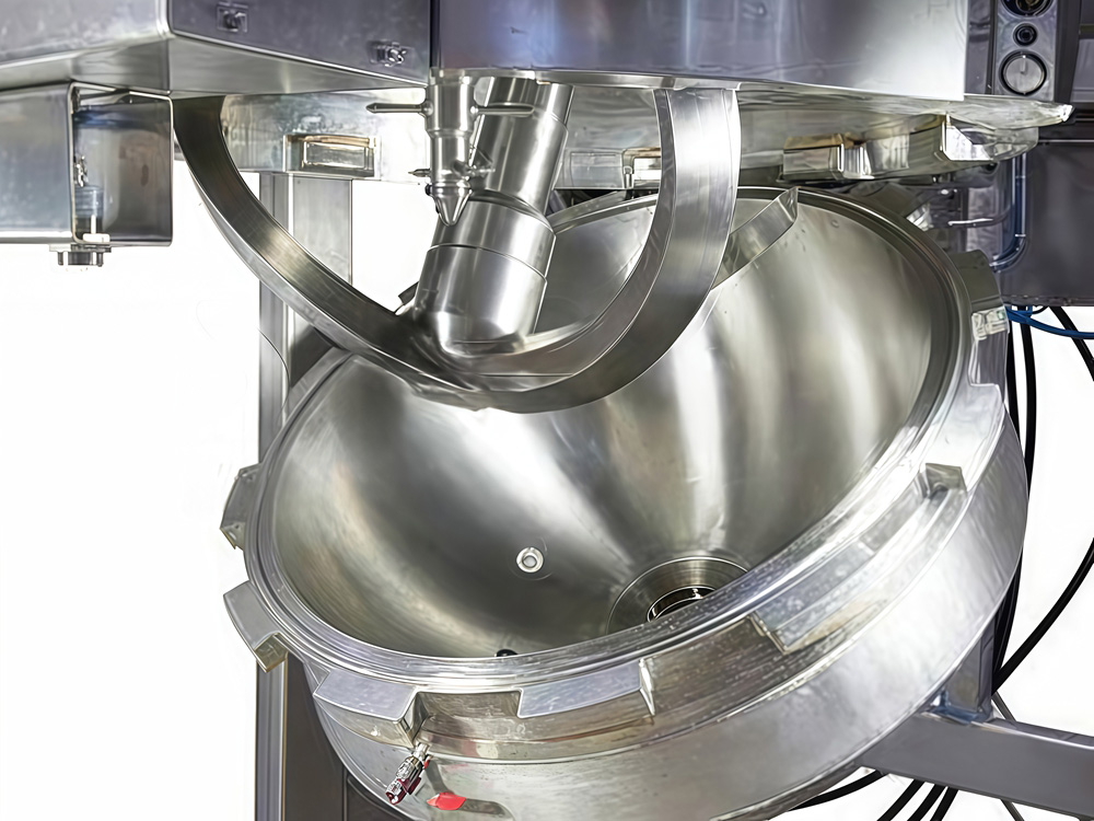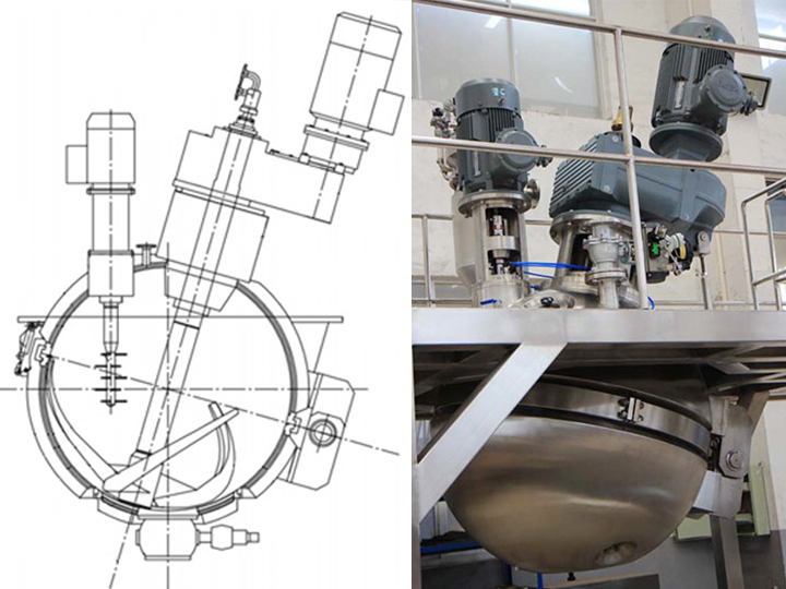 (5) 搅拌主轴向上倾斜,使主轴密封移到上半圆,脱离物料的侵泡,解决轴封污染物料和失效问题。主轴可以做独立转动达到对物料搅拌、刮削、混合和粉碎作用。
