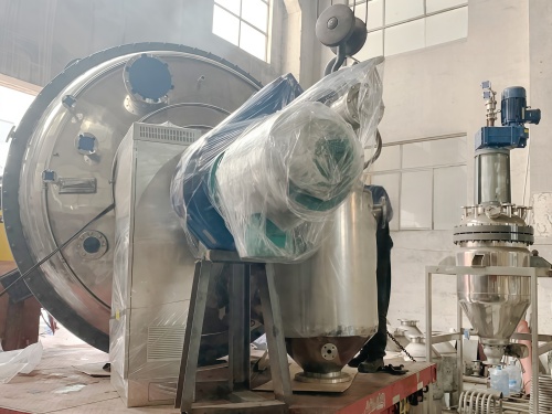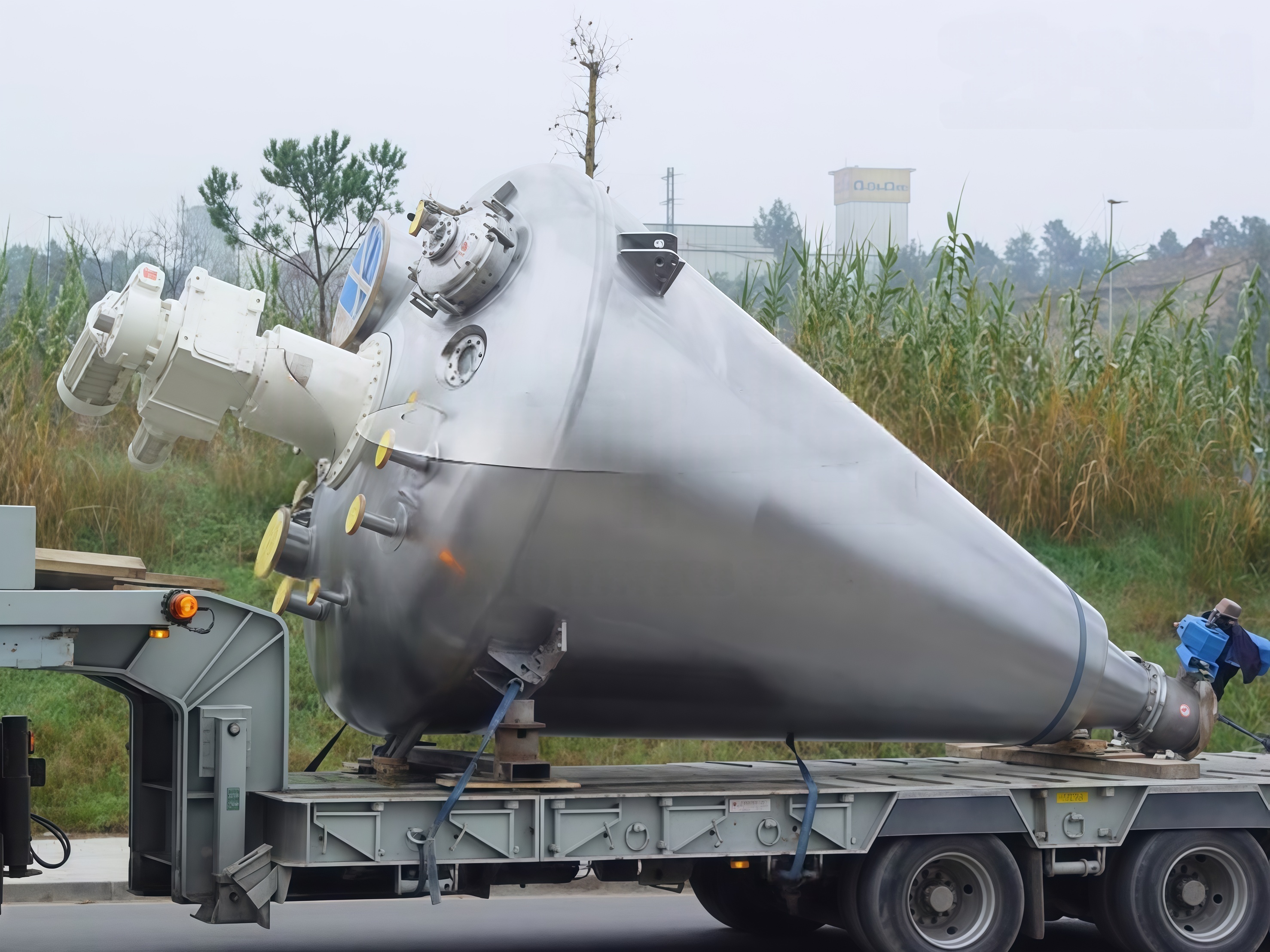 为解决上述的技术问题,无锡双瑞研制的大型重载式真空单锥干燥机(发明专 利号:202111275944.6),通过在下锥体内设置了双内加热螺带搅拌器,尤其是设置了变螺距螺带,从而运转时螺带带面上的各点线速度不同,物料在其作用下产生了不规则的对流、剪切、掺混、扩散,形成全方位的三维运动,而且内加热螺带还设置了新型内倾斜式结构,可有效解决物料粘结设备筒体内壁问题,适用性强,粘度大、热穿透性差,易滚球、易抱团成块的物料能得到高效的强制传热性能。