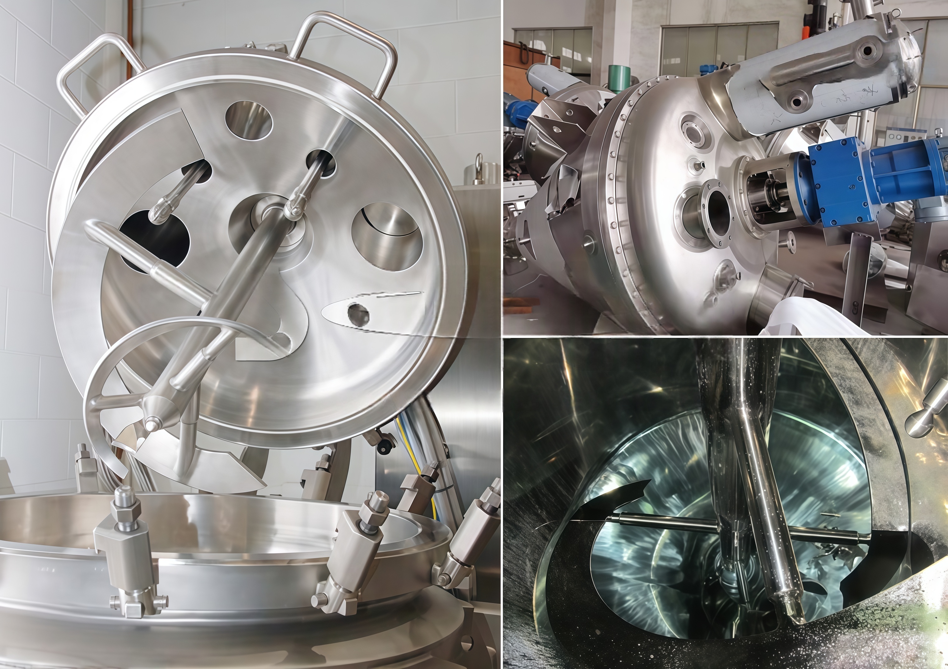 ⑥ 搅拌器底部紧贴锥体底部与出料阀密封球面,避免了死角,提高干燥和混合效率,排料干净无残留。