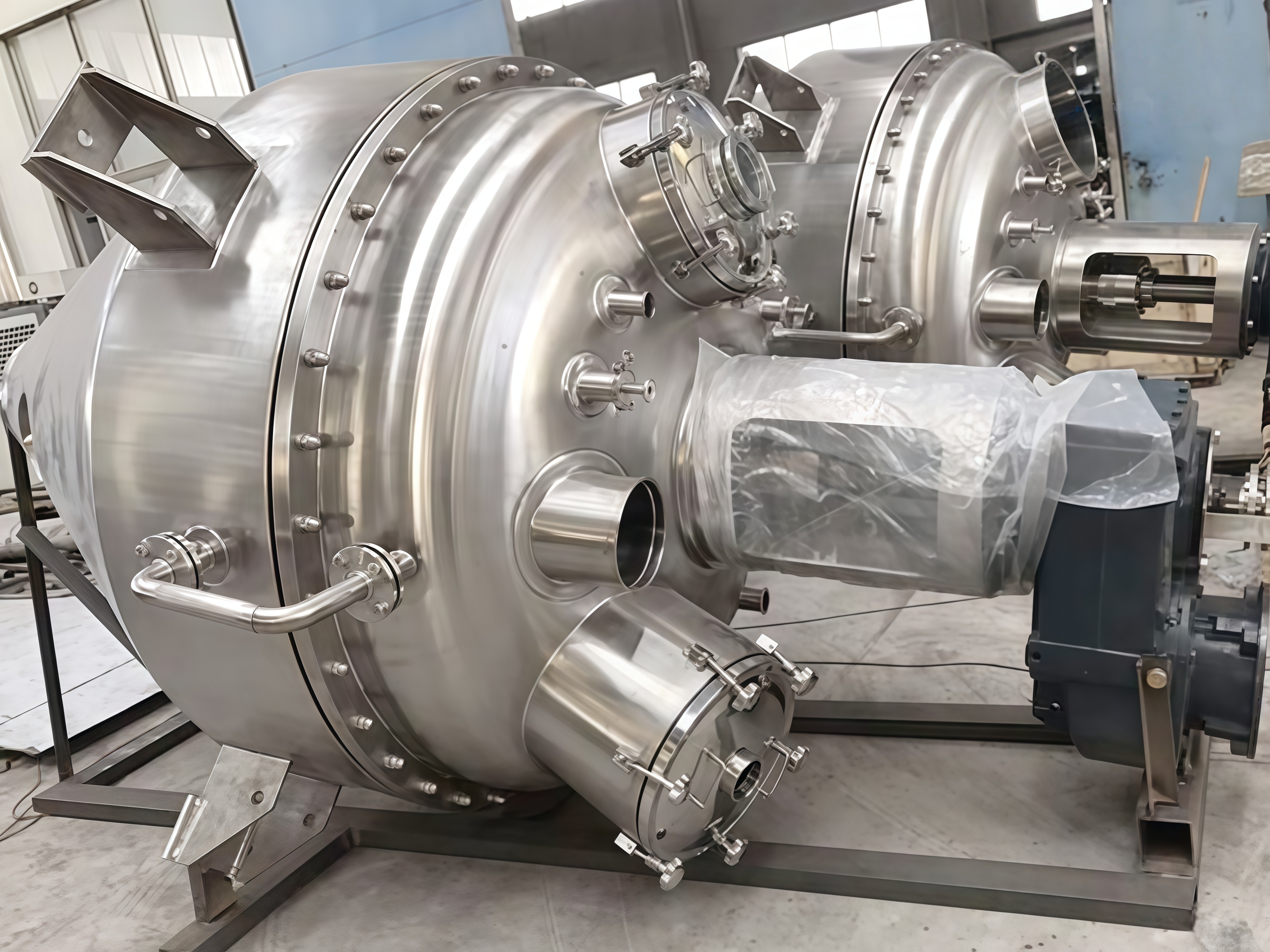 (2) 筒体:筒体包括封头和锥形筒体组成,封头和筒体有夹套加热和保温,开有必要的人孔、工艺管口、视镜。设置有搅拌器轴密封、底部出料阀,上部进料阀,粉尘过滤器。