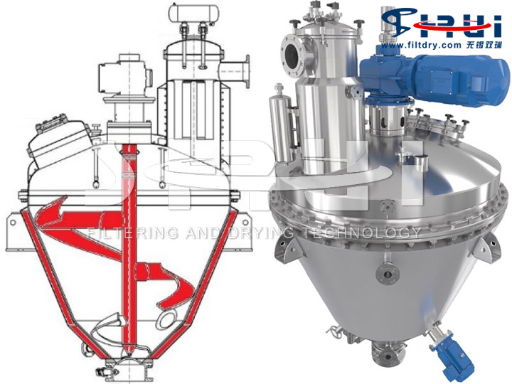 目前在制药或化工领域中,干燥设备普遍存在以下问题:① 干燥时间长,热效率低,混合效果不佳;② 物料粘壁,结块,需再次加工;③ 设备物料残留,交叉感染,设备清洗困难,产品易污染;④ 产品在干燥时通常会发生结块现象,水分被锁在硬块中无法获得良好的干燥结果,而安装破碎刀能够有效地解决这个问题,同时带来的好处是,湿料不会被沾在器壁上搅拌器接触不到的地方。然而,耙式干燥和锥式干燥的内部结构在安装破碎刀方面是受到限制的。⑤ 在清洗方面,由于耙式干燥zui低处为一条线,致使清洗液和溶解的产品无法完全排净,而且残留较多,GMP符合性一般。而锥形干燥由于底部空间狭小,加上搅拌轴是竖直安装的,设备底部区域不在喷淋球清洗范围之内,带来清洗上的困难。
